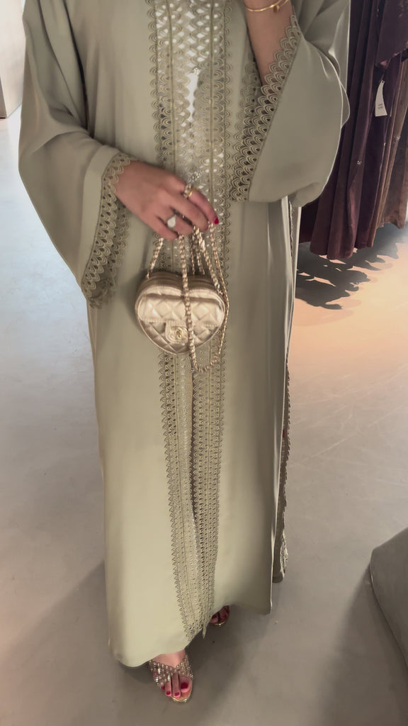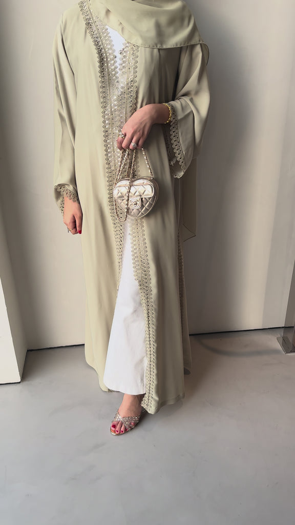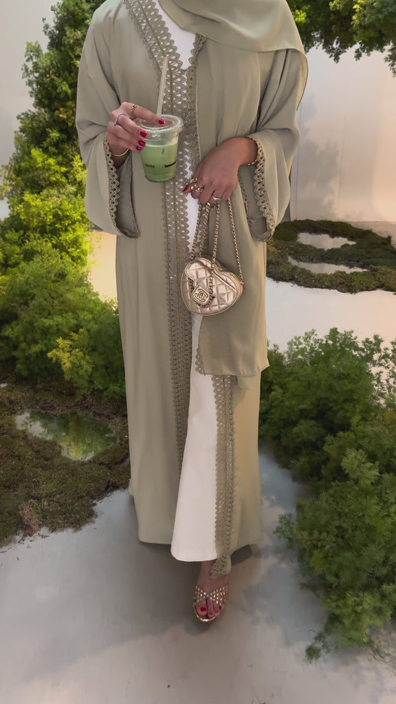 This abaya comes in a soft sage green, perfectly complemented by delicate lace trimming that flows along the front and sleeves — creating a look that is both modern and gracefully modest.