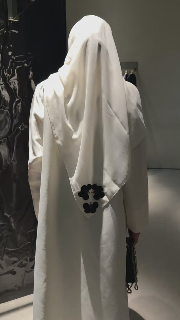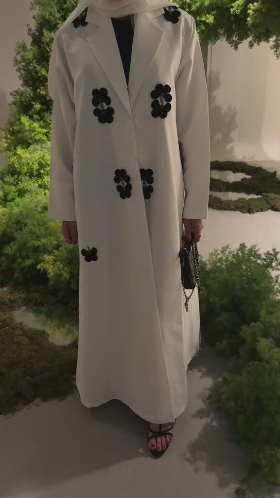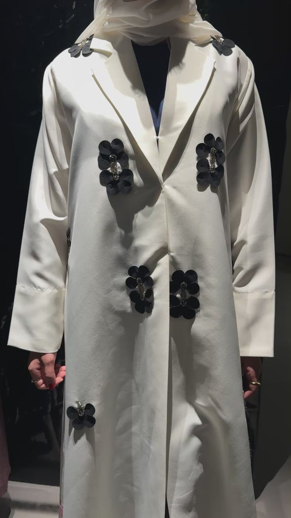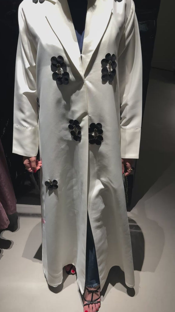 GG-24 features bold 3D black floral appliqués adorned with sparkling crystal accents, creating the perfect contrast against a creamy satin canvas.