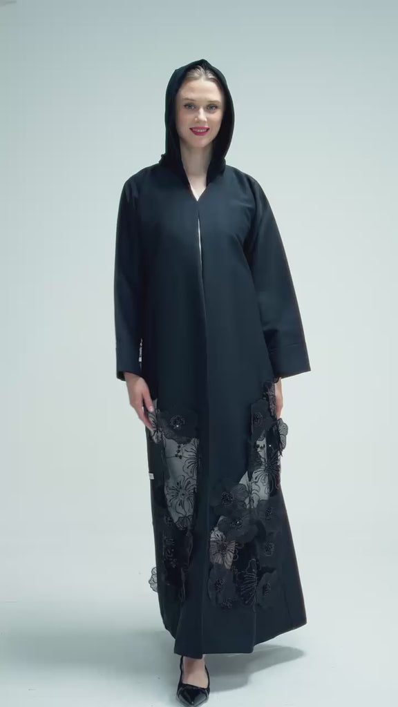 الوصف: عباية سوداء مزينة بزهور بارزة مطرزة بدقة على الأمام والخلف, تجمع بين القوة والأنوثة في تصميم واحد.