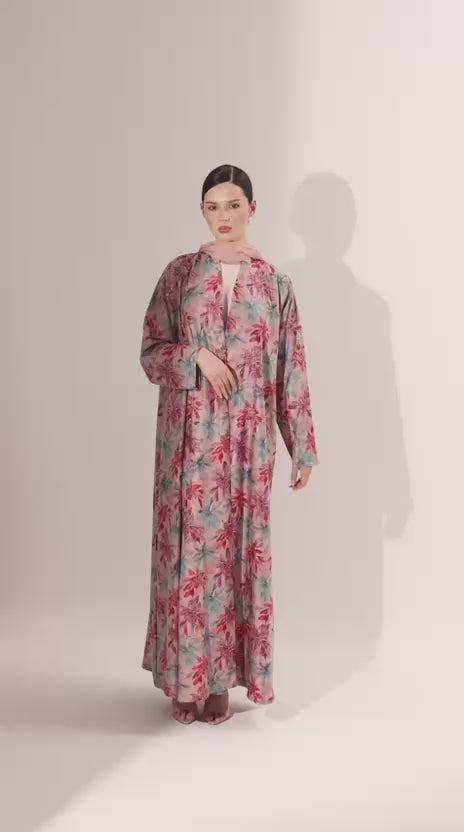 عباية كلوش مشغوله بالشك من الامام ، قماش التفته الخفيف ، متوفرة باللون الوردي مع تداخل اللون البنفسجي و العنابي و الاحمر ،